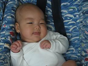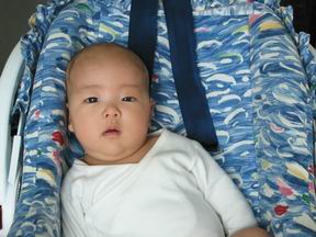 加拿大所有的孩子坐车都必须有 安全坐椅。坐椅分的很细,照片中的这个只能使用到孩子20磅。这个是一个朋友送的,在国外,没有父母在身边,朋友就显得更加重要。有了这个小坐椅,我们经常把它放在书桌旁边的小矮柜上。当我们在电脑前工作时,宝宝就坐在旁边看着我们。当我们面对电脑,她就手脚乱动,弄出很大的响声。转头看她,她会象做了错事,立刻停下,逗逗她,就会很开心的傻笑,知道你又注意她了。