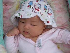 宝宝很胖,同样吃奶,她也不知道怎么就能比别的孩子都胖。她是我们认识的许多差不多大的孩子中最胖的一个,不仅是小胳膊小腿粗的象个健美运动员,脸也胖的往哪边睡哪边的肉就掉下来。看到宝宝的人都说我们养的好,宝宝看上去非常健康。希望我们的宝宝永远都健健康康。