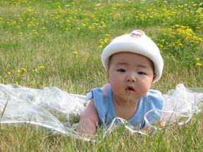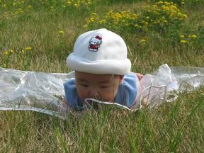 不知道为什么,宝宝对塑料布产生了极其浓厚的兴趣。一定要尝尝味道。尽管妈妈把塑料布尽量铺平,但聪明的宝宝仍然发现了其中的奥秘。原来塑料布很滑,宝宝趴在上面,两只手一并,硬硬的塑料布就弓了起来。透明的塑料布加上地上草的色彩,宝宝以为是一个东西,高兴的在上面一阵猛舔。宝宝趴过的地方到处留下了宝宝到此一舔的痕迹。