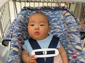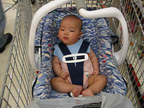 每次去买菜,都要带上宝宝的小坐椅。到了超市,就把她放在超市的大推车中。于是大推车几乎变成了宝宝的专用移动坐椅。真正采购的东西往往只能东塞西挤的见缝插针。采购完毕,宝宝就成了坐在蔬菜、水果和肉搭的小房子里的小看守。这时候我们再逗宝宝笑,别人就会奇怪的望过来,他们一定在想,这人,在发什么神经呢。