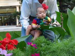 带着宝宝到楼下花园拍外景照。叫爸爸抱着,拍这几朵漂亮的花和草。不务正业的宝宝任凭妈妈又唱又叫,就是不肯看照相机。对身边的颜色鲜艳的花发生了兴趣。