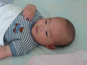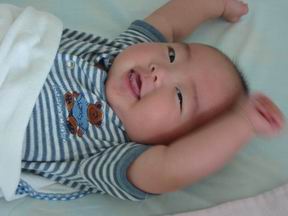 每天早晨,肯定是勤劳的宝宝先睡醒。4个月的宝宝已经很乖了,醒过来,总能自己玩一会。她会时不时的从小床的栏杆空隙处看看睡在床上的我们,如果发现我们闭着眼睛没有动静,就继续玩她自己的。到处张望张望,吃吃手指头,吃吃脚指头,吃吃小被子。
