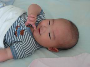 表达完她的开心后,宝宝进入常规性动作,伸伸懒腰,揉揉脸,然后很高兴的在我们微笑的目光下开始嘬手指头。宝宝伸懒腰的样子很好玩,那么短短的一个小胖胳膊,在头顶上伸的直直的,以小屁股为支撑,翘起小腿腿,用力一抻,很舒适的样子。才知道,原来那么小的孩子居然也知道伸懒腰了。