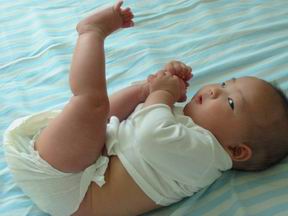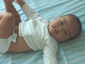 4个多月的宝宝开始对自己的脚丫子感兴趣。开始是由于不愿意老老实实靠在安全小坐椅中,宝宝总想坐起来。坐又坐不住,身子一会就整个压在了腿上。于是宝宝忽然发现了身子底下还有一个比手指更肥厚的可以吃的新玩意。