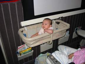 宝宝在飞机上挺配合,当时天气很好,没有碰上什么气流,飞机飞的很平稳,起飞降落也没有需要喂奶,小宝宝很安静的在我们的怀里,好奇的对着四周的人张望。宝宝是我们乘坐的这架飞机上第一个小客人,机上乘务员居然还不知道该如何安装小朋友的小坐骑。不过空姐可对宝宝宠爱有加,时不时来逗逗宝宝,宝宝一哭,她们可比爸爸妈妈还着急。但宝宝对她的小坐骑居然还不是非常满意,一有机会,就嚷嚷着要抱,可还真把同行的爸爸妈妈累坏了。