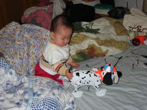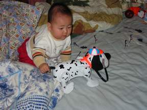 这是一只电动玩具狗,一开开关就会摇着尾巴汪汪叫着向前走,是上海的一个朋友来看我的时候送给宝宝的礼物,也是宝宝的第一个电动玩具。最早给宝宝展示玩具的时候,她还有些怕,看着摇头摆尾的一个大东西嚎叫着朝她走来,吓的直往我怀里钻。不过几分钟之后,发现原来这个东西并没对她造成威胁,于是例行常规的先把小狗狗从突出的鼻子到翘起的尾巴啃了个遍。再后来就发生了这一让我们捧腹的一幕,小狗狗拼命的往前走,小宝宝使劲的拉着尾巴往后拽。
