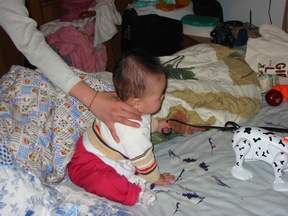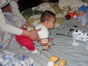 妈妈把小狗狗重新放回小宝宝身边,小宝宝对不听话的小狗狗有些失去耐心了,正在左顾右盼看看又什么新花样。
