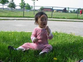 这是在买菜的超市附近的草地上拍摄的。对面还有一个儿童活动场地,每次来买菜,妈妈去采购,爸爸就带丫丫来这里玩。