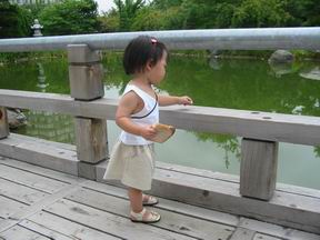 夏天,带着丫丫去对面的日本公园玩,丫丫最喜欢带上面包喂小鱼。池塘里还有乌龟和鸭子。鸭子通常最灵活,乌龟最迟缓,总是抢不到食。