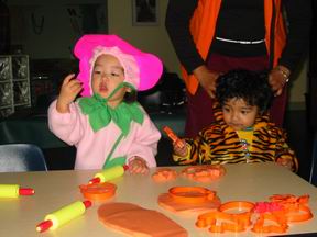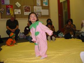 每个星期五上午是MOTHER GOOSE的活动时间。有两个老师教我们各种儿歌,这天又刚好是万圣节,于是大家都穿戴起来,一起欢度节日。现场气氛非常热烈。