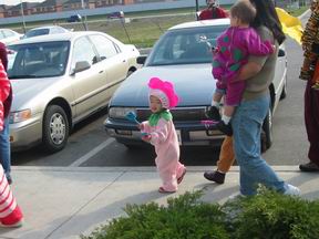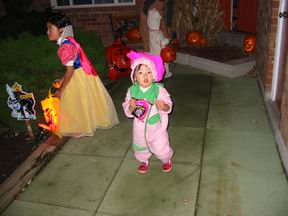 晚上和几个朋友的孩子一起去敲门要糖,路上无数牛鬼蛇神。有些面目可怕,有些美丽的象神话故事里的仙女。有些房子布置的很有意思,门口和屋内装饰了许多过节的饰物。一开门让人吓一跳。要糖可不是轻松的活,挨家挨户的敲门,每家都要上楼梯,下楼梯,丫丫都要我这个随从搀扶进行的。人家孩子一见开门,都忙着大大的撑开带子,多多益善,丫丫这个小傻瓜,人家一开门,要不就冲人家扭屁股,要不就对各种装饰看的发呆,最后往往是妈妈尴尬的笑笑,赶紧接过糖,拎起丫丫,说声BYEBYE立马撤。