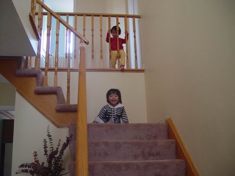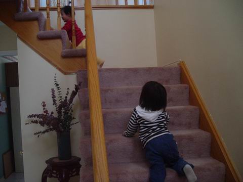 上下楼梯是丫丫的最爱,到任何一家有楼梯的房子,楼梯就成了丫丫最大的玩具。她会把楼梯当滑梯,一个屁墩一个屁墩的从顶上滑下来。也不怕颠疼了她的小屁股,到底是有尿布,缓冲能力不小啊。这是两个小朋友在楼梯上追逐,虽然Andrea妈妈总谦虚小Andrea的运动能力,但见过了才知道,Andrea可一点不差,这楼梯爬的,比猴子还快,眨眼就已经在顶上了。