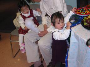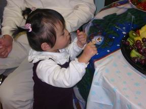 爸爸公司举办给孩子的圣诞PARTY。两个小谗猫一到PARTY,就不顾一切的大吃特吃。刚到PARTY的丫丫端着爸爸盛满水果,糖,巧克力,饼干的盘子,一言不发的发起进攻。ANDREA已经开始自给自足,自力更生。深知这时候求人不如求己,小人往桌边一站,两手可就没闲过了。