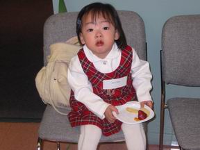 丫丫吃的一脸一嘴,这个小饭桶,自从感冒痊愈后,就象个无底洞,有多少东西都可以塞多少东西。看着盘子里日渐稀少的货色,丫丫可着急了。