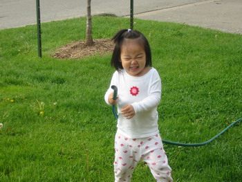 玩草地上的浇花管子也是丫丫的最爱,她会拖来拖去的装模做样的浇浇花,浇浇树,偶尔没注意她,还会放到嘴里洗洗牙。